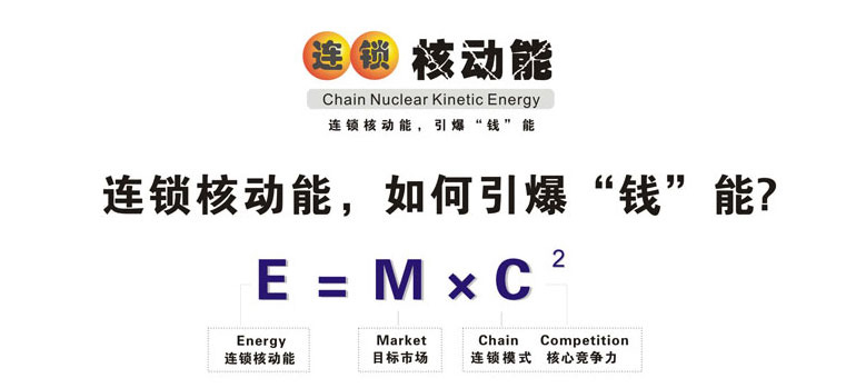 • 廣州采納企業(yè)管理顧問有限公司陳宏創(chuàng)建的連鎖核動(dòng)能理論 以愛因斯坦的能量公式為基礎(chǔ)創(chuàng)建,其理論意義是: 企業(yè)找準(zhǔn)了目標(biāo)市場(chǎng),以連鎖的方式經(jīng)營(yíng),核心競(jìng)爭(zhēng)力越大, 推動(dòng)其發(fā)展能量就越大。